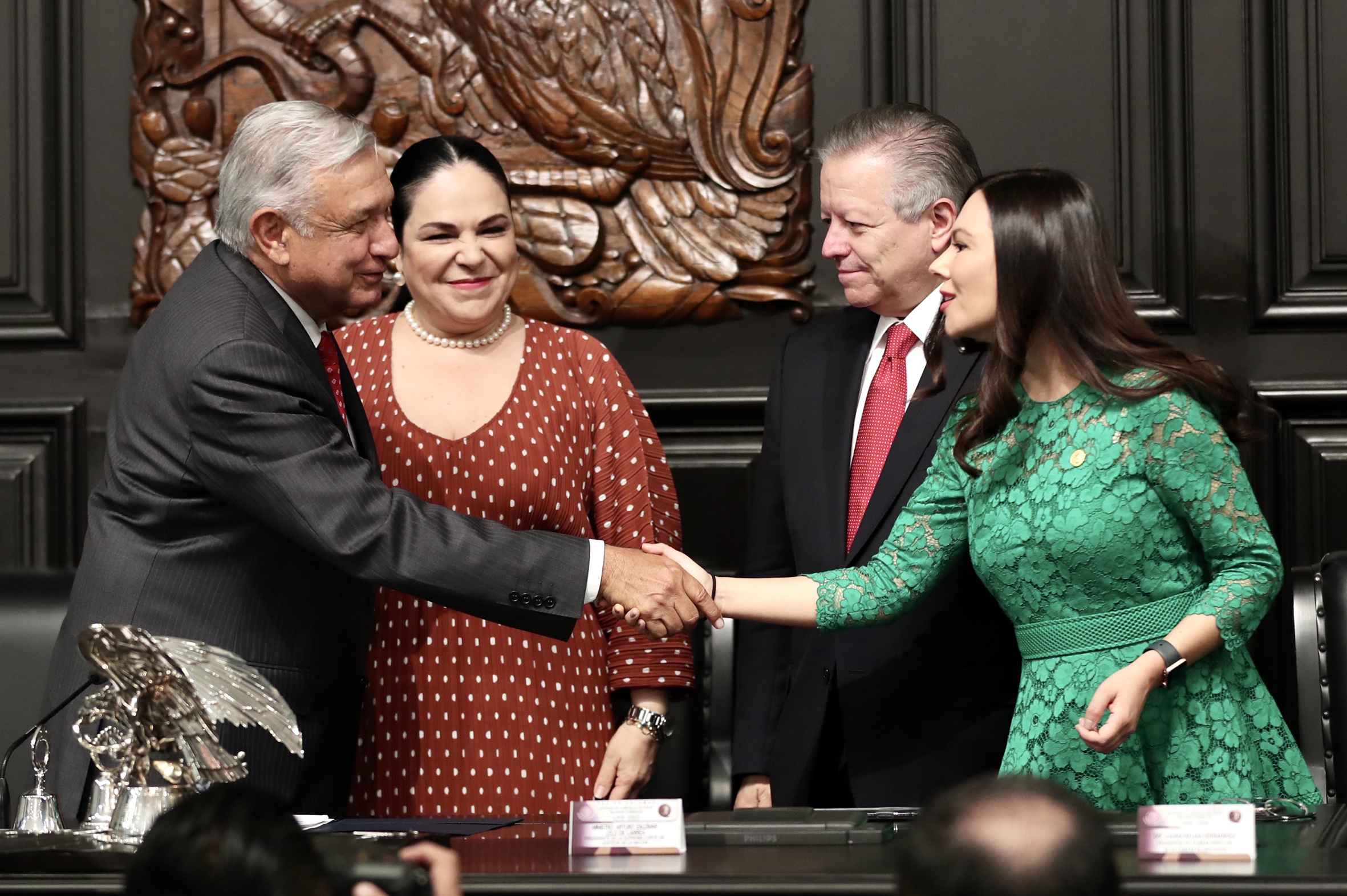 Presidente Andrés Manuel López Obrador, Sen. Mónica Fernandez, Mtro. Arturo Zaldívar y Dip. Laura Rojas