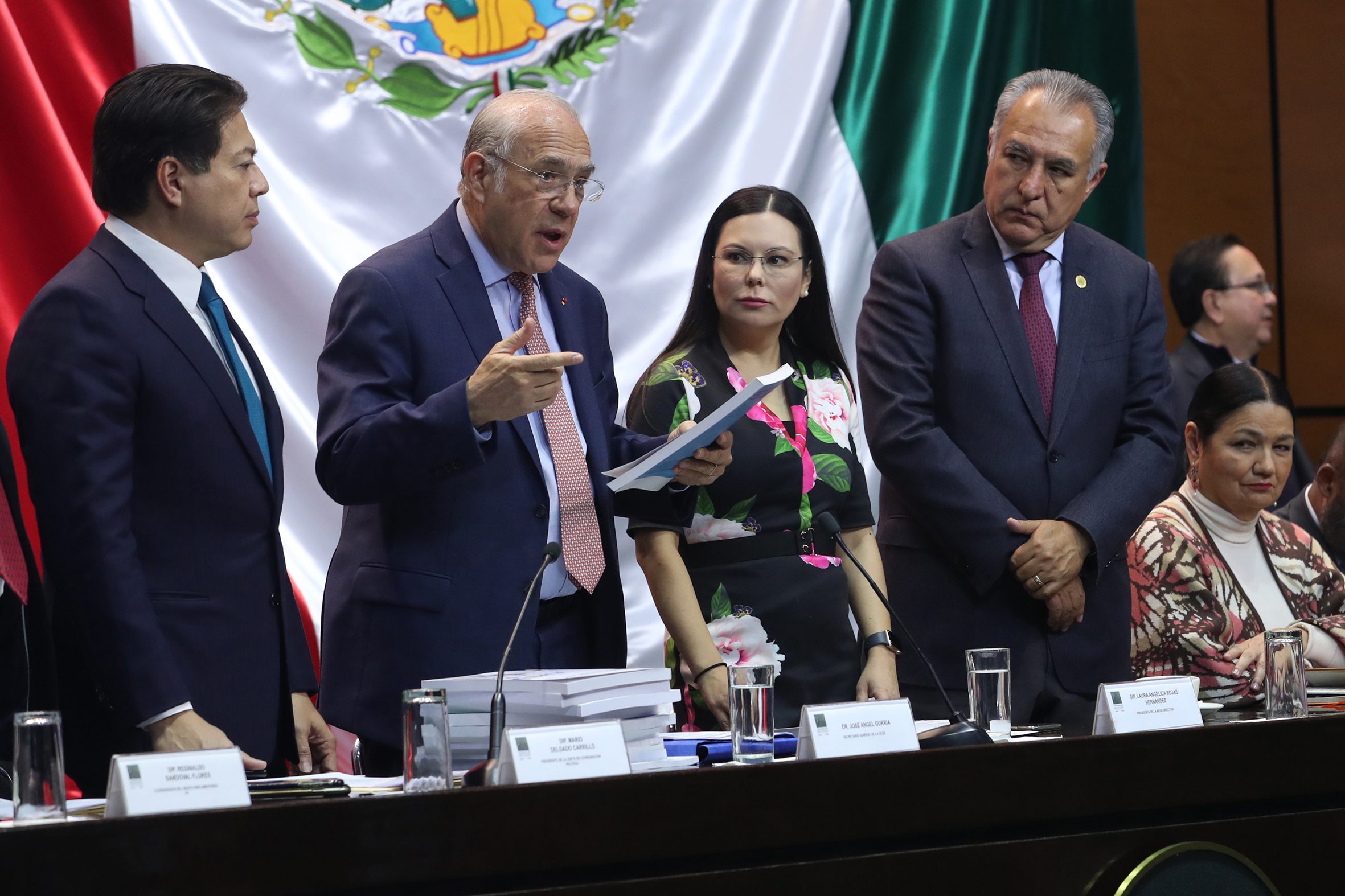 Dip. Mario Delgado, José Ángel Gurría Secretario de la OCDE, Dip. Presidenta Laura Rojas, Dip. Marco Adame y Dip. Dulce Sauri